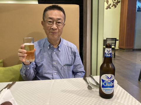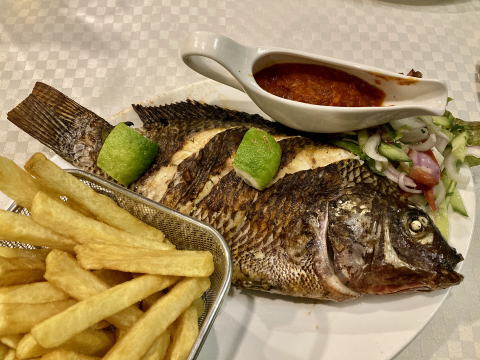 夕食はホテルのレストランでとった。僕はティラピアのグリルを、妻はナイルパーチのフィッシュアンドチップスを注文した。ティラピアは一匹を丸ごと焼くので時間がかかると言われたので前菜にトマトのブルスケッタも注文した。そして飲み物は僕のお気に入りのクラブビール。ピルスナータイプの優しい飲み口でとてもおいしいビールだ。初めて飲んだ妻も気に入ってくれた。食後にはデザートの代わりにウガンダ特産のパイナップルを使った甘いカクテル、ピニャコラーダを注文した。とてもおいしかったが量が多くて酔いが少し回ってしまった。