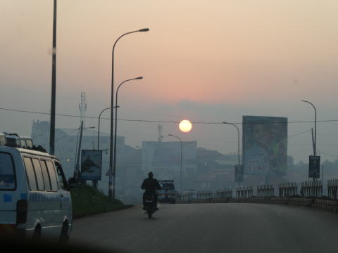 エンテベ市内を走っていると真正面から日が昇ってきた