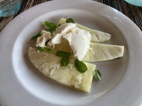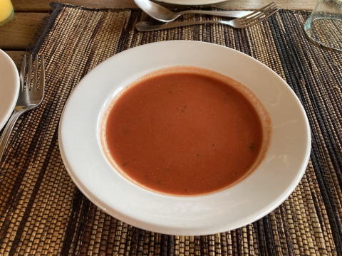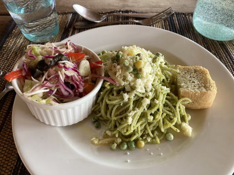 母屋の食堂に戻って昼食をとった。ここでの昼食と夕食は前菜、メイン、デザートの3コース構成だ。メインは肉系と野菜系の2種類から選ぶことができた。ずっと座っていただけでそれほどお腹が空いていなかったのでメインは野菜系のジェノベーゼパスタにした。丁寧に作られた料理だった。とてもおいしかった。