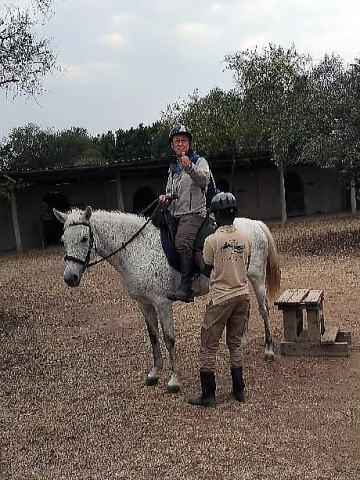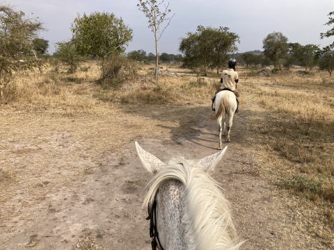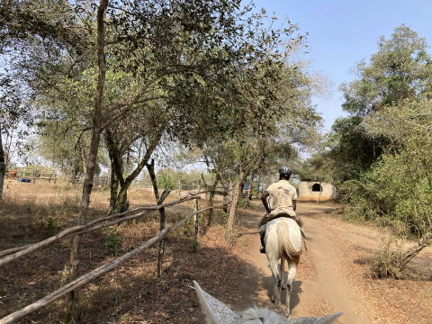 半分ほど引き返したところで僕の馬の引き綱を持っていたスタッフが引き綱を外した。ここからは自分で馬をコントロールしろということだ。不安もあったが自由になれた爽快感もあった。馬も自分のペースで歩けるようになってどこか嬉しそうだった。30分ほど一人で馬を操った(というよりは馬が上手に乗せてくれたというのが本当だろう)。途中、馬の足元の茂みからサバンナモンキーが飛び出してきて馬が驚き僕が馬上でバランスを崩しかけるハプニングもあったが手綱をしっかり握っていたのでリカバリーすることができた。10時半に厩舎に戻った。妻も後半は馬上でリラックスしていて楽しそうだった。そんな妻の様子を見ていてとても嬉しかった。