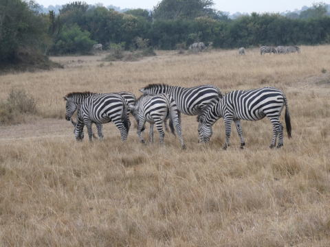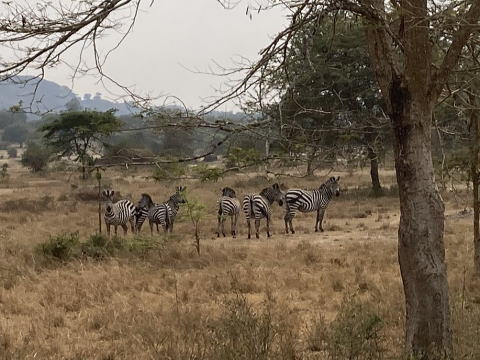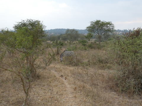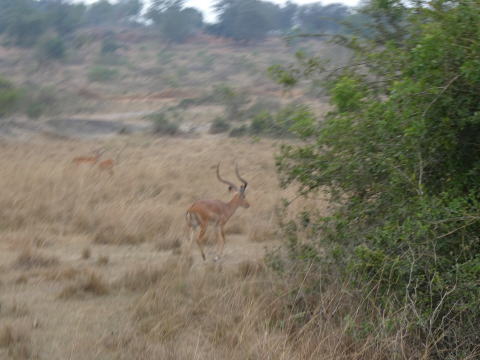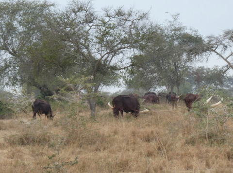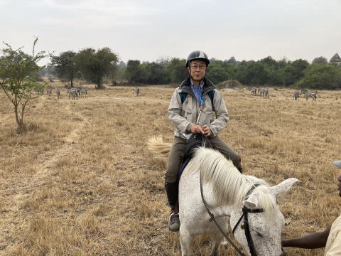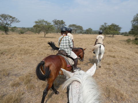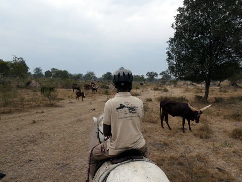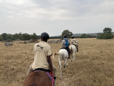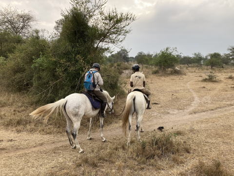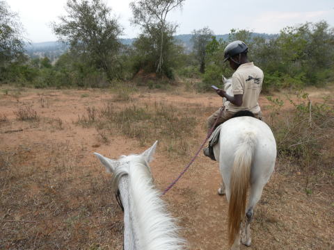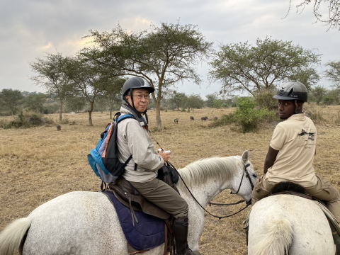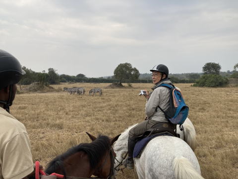 二人とも全くの初心者だと話しておいたのでスタッフが引き綱を持って出発した。スタッフの乗る馬のすぐ後ろについて進んでいった。緊張感もあったが高揚感も強かった。丘の麓に降りてアンコーレ牛が放牧されているエリアを進んでいった。この辺りは国立公園の外だがシマウマやイボイノシシ、インパラなどがたくさん見られた。シマウマはかなり近くまで寄っても逃げなかった。