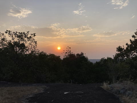 ロッジに戻ると日が沈みかけていた。コテージの玄関の横が最高のビュースポットだった。木々の向こうに赤く染まって沈む夕日を堪能した。