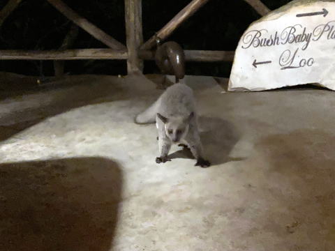 この日はもう一種類初めて見る動物と出会えた。ブッシュベイビー(ショウガラゴ)だ。バーのスタッフがロッジの近くに生息しているブッシュベイビーに毎晩餌を与えているというので夕食前にバーに見に行った。森から現れたブッシュベイビーが枝に刺したバナナを器用に手で取って食べていた。かなり俊敏な動きだった。