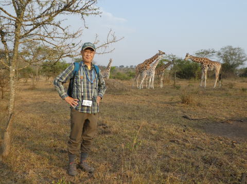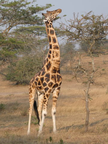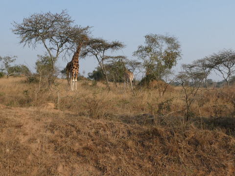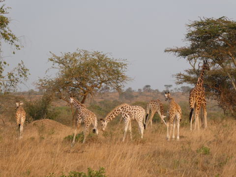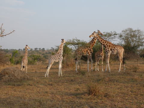 低木がまばらに生えた草むらをキリンがいる場所を目指してアリシアに続いて歩いた。ここでは徒歩で動物に近づける距離が30mと決まっている。その距離まで近づいた。キリンたちが食事をしたり寛いだりしているのが肉眼ではっきりわかる距離だった。全部で10頭ほどの群れだった。3頭のこどものキリンが一本の木を取り囲んで食事をしている様子がとてもかわいらしかった。ゆっくり移動しているキリンの群れと一緒に歩きながら観察した。アリシアがキリンの生態についていろいろ教えてくれた。1時間ほどキリンの群れと行動を共にした。