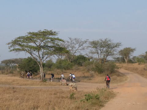 一般的に国立公園内のゲームドライブでは動物に襲われる危険を避けるため車から降りることは禁止されている。しかしここムブロ湖国立公園では日中に人を襲う可能性のある動物がほとんど生息していないのでレンジャーが同行することを条件に徒歩やマウンテンバイクで国立公園内を移動することが許されているのだ。