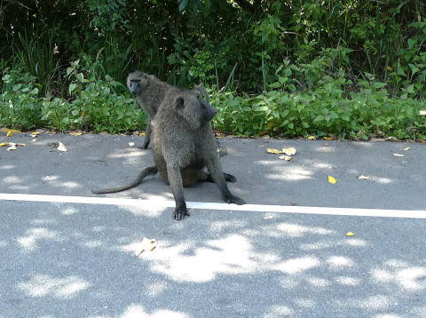 国立公園のゲートからパラアに続く道は整備された舗装路だった。道路脇にはバブーンの姿があった。森の中の道をしばらく進むと前方の視界が開けた。この先はナイル河畔の低地に森が広がっているのだ。景色の変化を楽しみながら先に進んだ。
