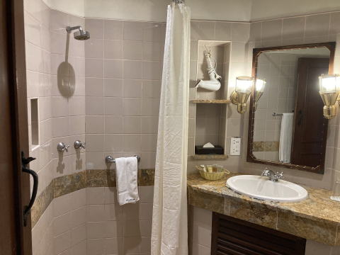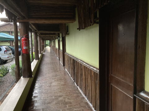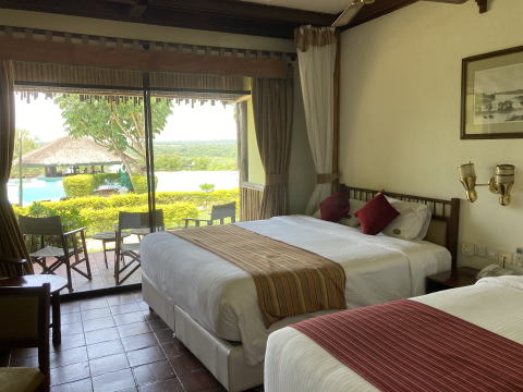 チェックインの後すぐに客室に入ることができた。エアコン付きの快適な部屋だった。ミヒンゴロッジではソーラー発電のため自室ではヘアドライヤーが使えなかったりお湯の温度が上がりにくかったりしたがここではそうした心配は全くなかった。部屋は1階でテラスの先がプールだった。