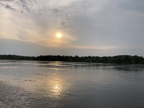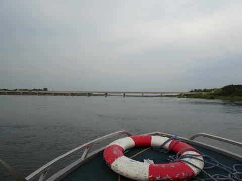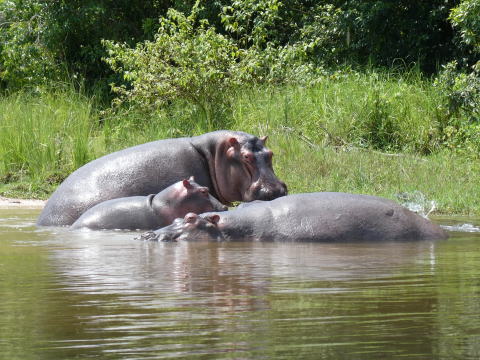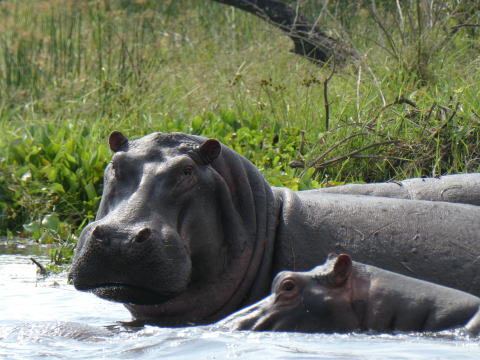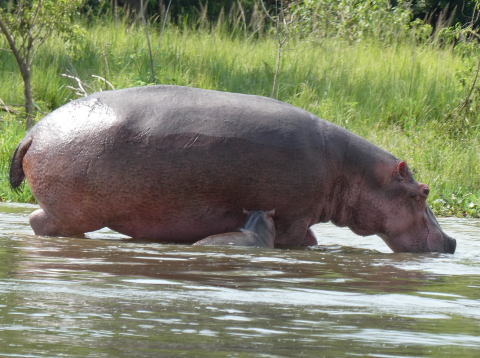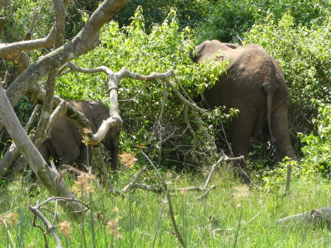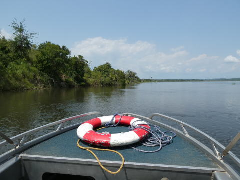 滝を見た後は下流に向けてボートを走らせた。橋をくぐりアルバート湖河口部のデルタ地帯を目指した。橋より下流では動物の姿がより多く見られた。生まれたてのこどもを連れたカバや水辺で食事をするアフリカゾウの様子などを見ることができた。橋から1時間ほどかけてデルタまで下った。