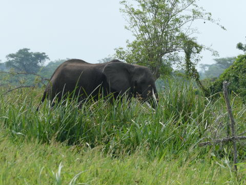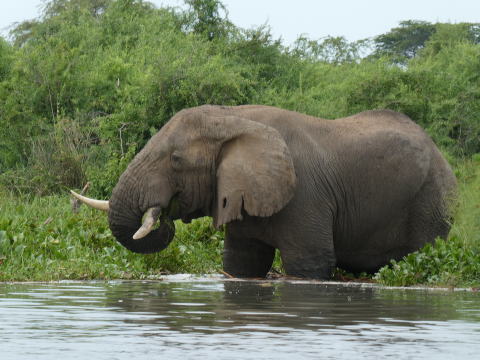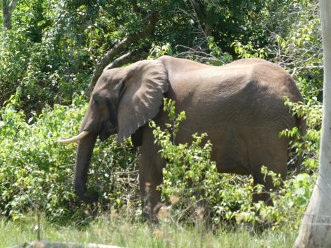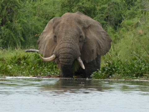 遡航中に妻が川岸にいるアフリカゾウを見つけた。出発前から野生のゾウが見たいと言っていた妻は,、最初のゾウを自分で見つけたことをとても嬉しがっていた。