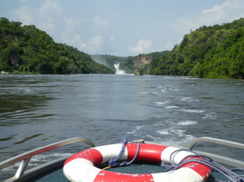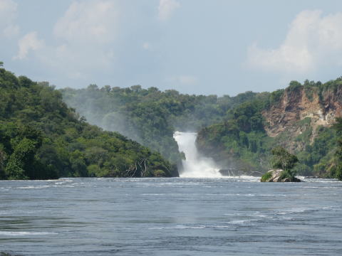 しばらく進むと滝が見えてきた。マーチソン滝だ。ナイル川最大の滝で落差は43mある。近づくにつれて川の流れが速くなり滝から聞こえてくる音も大きくなった。水量が多くて直下までは行けなかったが迫力は十分に感じることができた。スケールの大きな滝を目前にして妻が驚嘆していた。