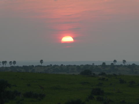 少しするとサバンナの地平から日が昇ってきた。赤い太陽だった。この光景も僕が妻に見せたかったものだ。前日は曇天で日の出を見ることができなかったので見ることができて嬉しかった。