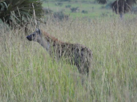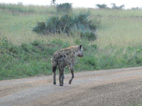 トラックを走行中に何気なく後方を振り返ると草地を歩く動物が目に入った。今まで見てきた動物とは異なるシルエットだった。デジカメのズーム機能を使って確認するとハイエナだった。夜行性のハイエナを明るいときに見ることができるのはとてもラッキーなことだ。すぐにアッバスに車を停めるよう伝えて写真を撮った。