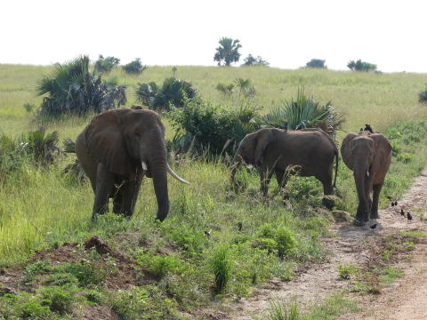 舗装路からトラックに入ってすぐに遠くにアフリカゾウの群れを見つけた。3頭の子ゾウを含む10頭ほどの群れがゆっくり移動していた。