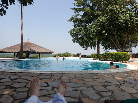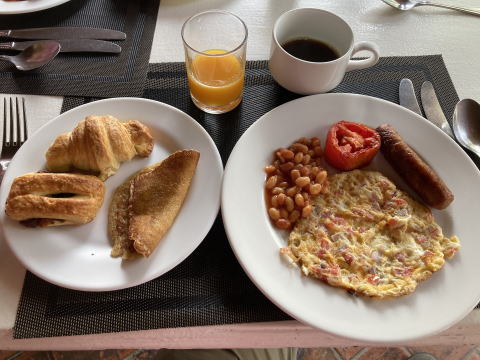 9時45分にロッジに戻りすぐ朝食をとった。朝食で皿にとる料理はほぼ決まってきた。食後は昼食まで特に予定がなかったのでこの日もプールに入って身体をクールダウンさせた。