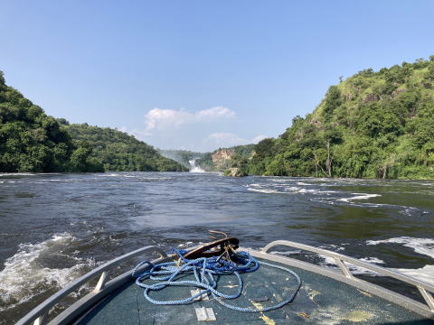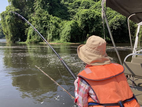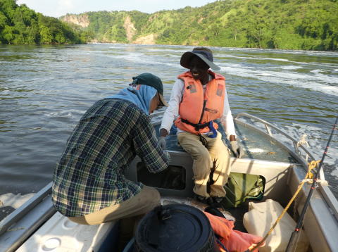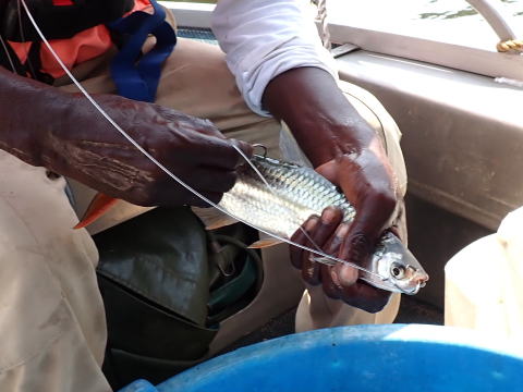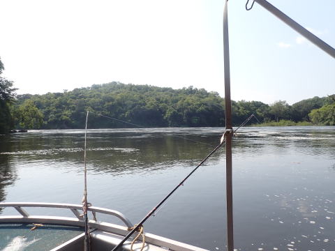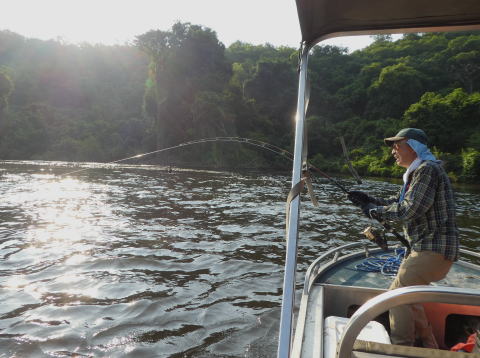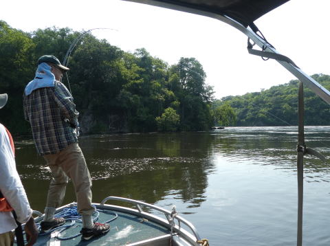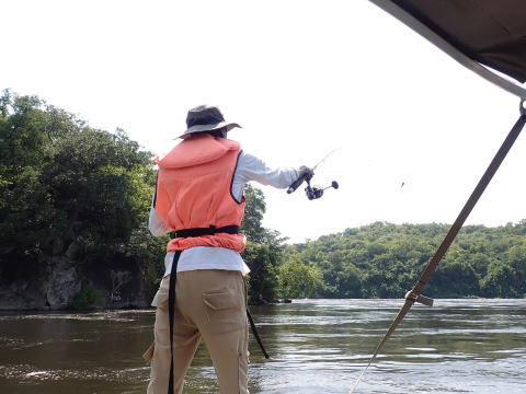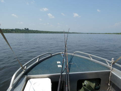20分ほどで釣り場に着いた。最初のポイントは左岸にできた大きなワンドだった。アンカーを下ろしてボートを停めた。メインターゲットであるナイルパーチはルアーで狙うこともできるが一番確実性が高いのは生きた魚を餌にしたブッコミ釣りだ。タックルはボート会社に用意してあるものを使った。仕掛けもスタンレーが準備してくれた。