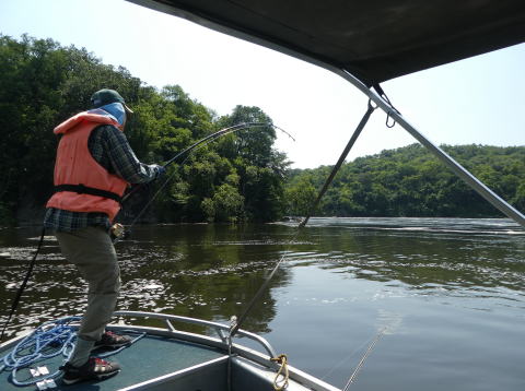 そんなことをしているとナイルパーチ狙いのロッドにアタリがあった。今度は僕がファイトする番だ。大きく合わせるとしっかりした魚の抵抗が伝わってきた。かかった魚は走ろうとはせず底に張り付いて抵抗した。どうやらパーチではなくキャットフィッシュのようだった。抵抗はかなり強かった。ポンピングを多用してリールを巻いて手元に寄せた。最後はスタンレーが下顎を掴んでボートに引き上げてくれた。