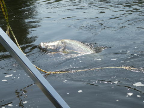 再投入を見届けてルアーをキャストしようとしたところまたもアタリがあった。今度は少し待ってしっかり合わせた。ずっしりとした手ごたえが伝わってきた。かかった魚は大きそうだった。ロッドを立てて魚にプレッシャーをかけた。そしてポンピングしながら慎重にリールを巻いた。魚はなかなか寄ってこなかった。抵抗が少し弱くなったと感じた次の瞬間、大きな魚の上半身が水面を割って姿を現した。確実にメーターオーバーのナイルパーチだった。ラインを張ってテンションを維持し、針を外されないようにした。そしてより一層慎重にファイトした。