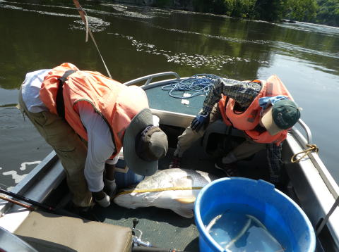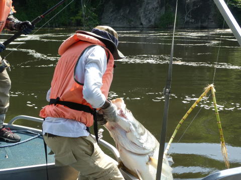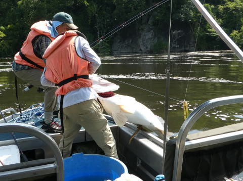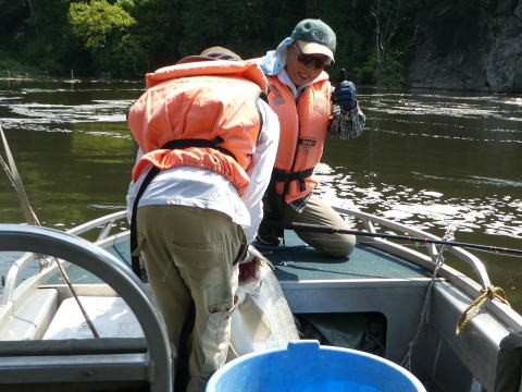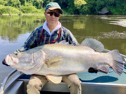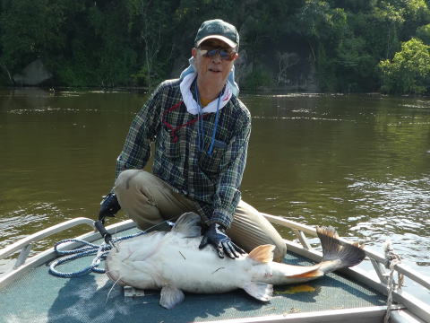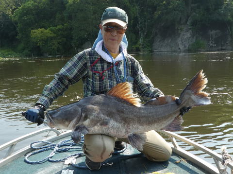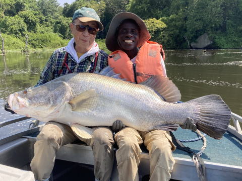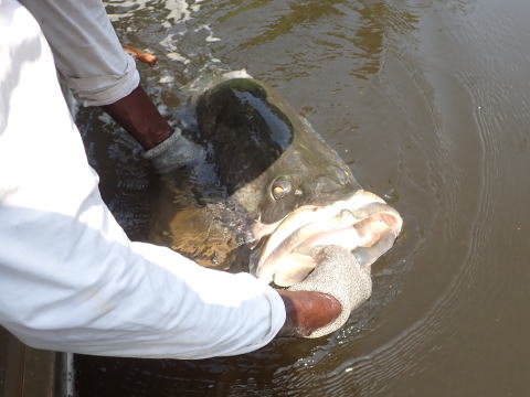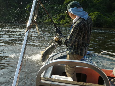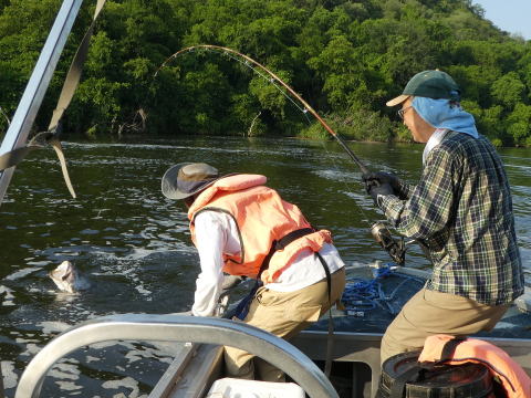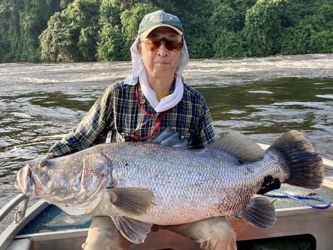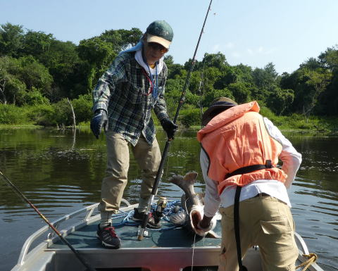 ボート際に寄せても魚の抵抗は弱まらなかった。だが焦る必要はない。時間をたっぷりかけてファイトした。最後はボート際に魚を寄せてしっかり浮かせ、待ち構えていたスタンレーが魚の下顎をがっちり掴んだ。僕も魚の下顎を持って二人でボートの中に引きずり込んだ。ファイト中に感じていた以上に大きな魚だった。計測すると体長は143㎝あった。体重は推定52㎏。いきなり大物が釣れてみんなで大喜びした。まだ釣りを始めてから20分しか経っていなかった。写真を撮った後は魚を川に戻し、ボート際でしばらく保持して呼吸と体力を回復させてからリリースした。