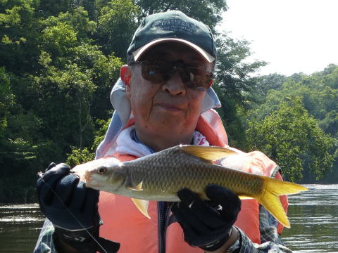 お祭り騒ぎもさすがにここまでだった。この後は岸際にルアーを投げて小魚を釣りながらアタリを待った。ルアーへの反応は上々だった。すぐにアワカが釣れた。ナイルパーチ釣りの生き餌によく使う魚だ。次に釣れたのはナイルバルブだった。ナイルバルブは初めて釣った魚だ。コイ科の魚で盛り上がった背中が特徴的だ。いずでのヒットルアーも僕が一番信頼を置いているマイヤーパンサーだった。妻もルアーフィッシングに挑戦した。すぐに良型のアワカがかかった。船縁まで寄せてきたが魚が大き過ぎて引き抜こうとした際にフックが外れてしまった。
