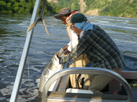 そんな時リールからラインが勢いよく出始めた。最後の最後に魚がかかったのだ。慌ててロッドを持ってファイトを始めた。かなりの手ごたえだった。かかった魚はボートの周囲を泳ぎ回って抵抗した。なんとかボート際まで寄せても抵抗の強さは変わらなかった。ボートのすぐ傍でジャンプした魚体が夕日に照らされて銀色に輝いた。大きなナイルパーチだった。さらにその後はボートの下に潜り込んで抵抗した。ラインがアンカーロープに絡んだり船底に擦れたりしないように注意してファイトした。5分ほどのファイトの末にようやく決着が付いた。船縁まで寄せた魚の下顎をスタンレーがしっかり掴んでくれた。この魚も二人がかりでボートに引き上げた。