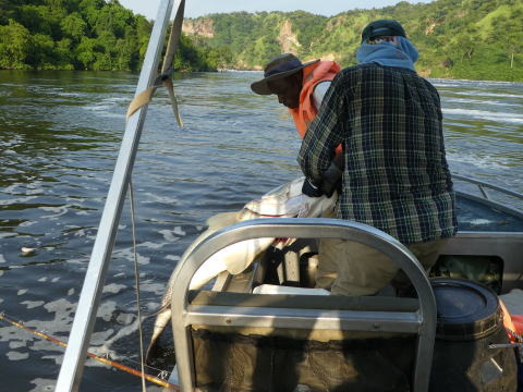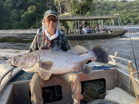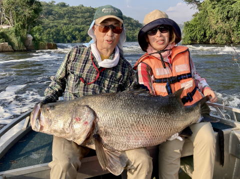 釣れたのは132㎝42㎏あるナイルパーチだった。正確な年齢はわからないが風格の漂う老齢魚だった。釣りをしていた場所は日が陰ってきたので日の当たっている下流に移動して写真撮影をした。ちょうど通りかかったリバークルーズの乗客たちが驚いた表情でこちらを見ていた。