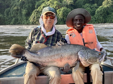 魚は少しずつ寄ってきた。水面上に姿を現したのはスーダンキャットフィッシュだった。妻はナイルパーチではなくて少し残念そうだった。ボート際まで寄ってきた魚をスタンレーがハンドランディングしてくれた。102㎝12㎏ある良型魚だった。妻がすこし怖がりながらも膝の上に乗せて記念撮影した。