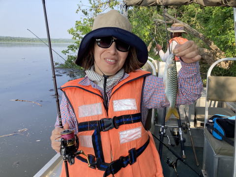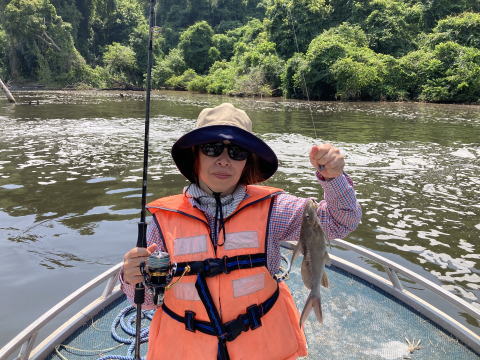 次のアタリは妻がファイトした。今度の魚も良い引きだった。引きを楽しみながらリールを巻いていた。釣れたのはスーダンスクイーカーというナマズだった。釣りあげるとキューキュー鳴くことからスクイーカーと名付けられている。この日も鳴いていた。