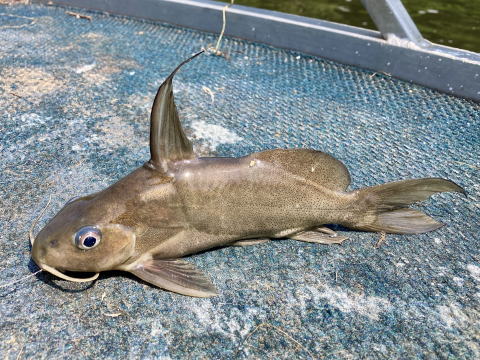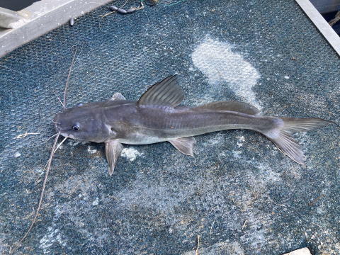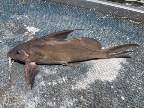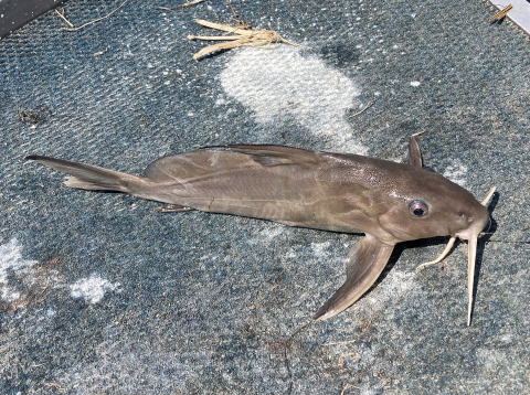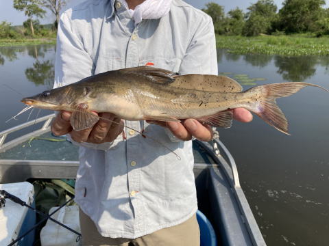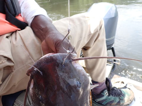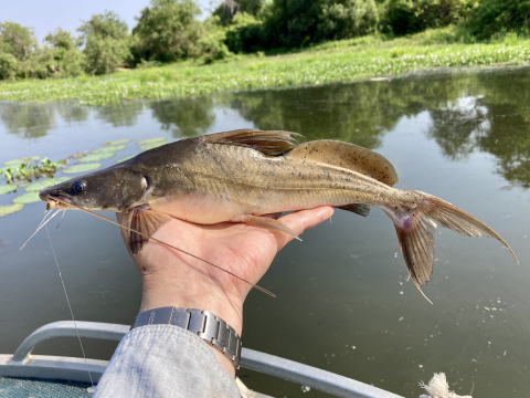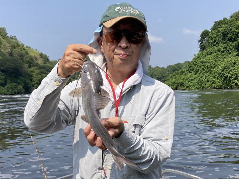 次に釣れたのもナマズだった。先ほどの魚よりやや大きく胴体が細長かった。こちらはナイルスクイーカーという種類だ。これで4種類のナマズを釣ることができた。
