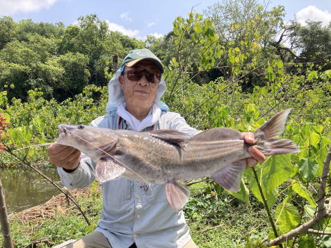ここではアタリを待つ間にミミズ餌のブッコミ釣りをした。こちらは釣り始めてすぐにアタリがあり35㎝ほどのナマズが釣れた。スーダンキャットフィッシュの小型魚だった。